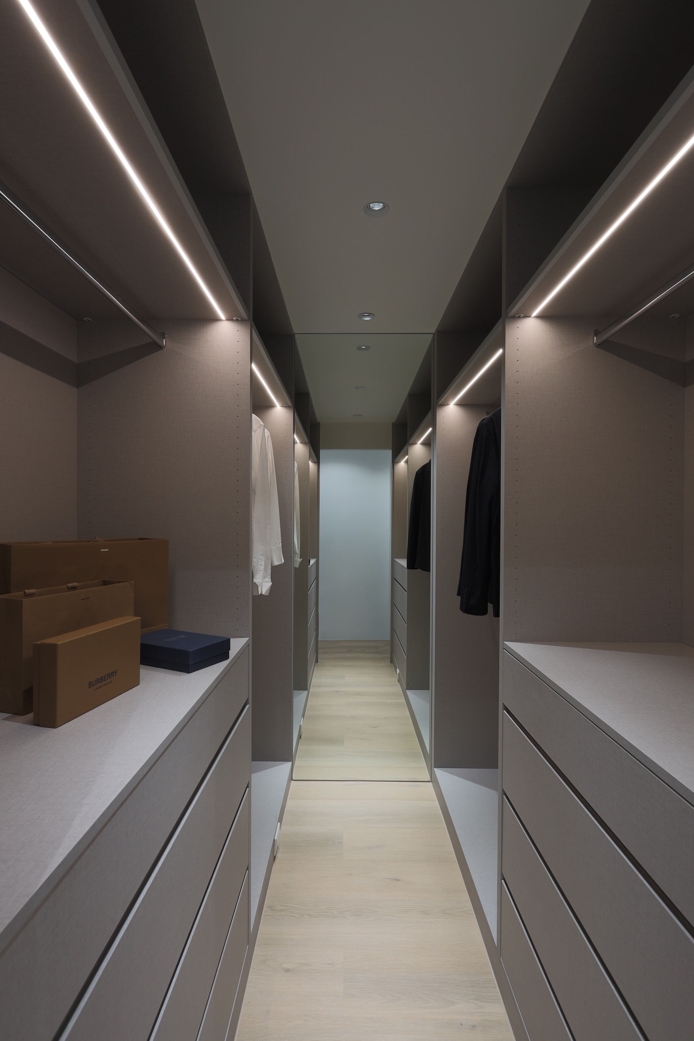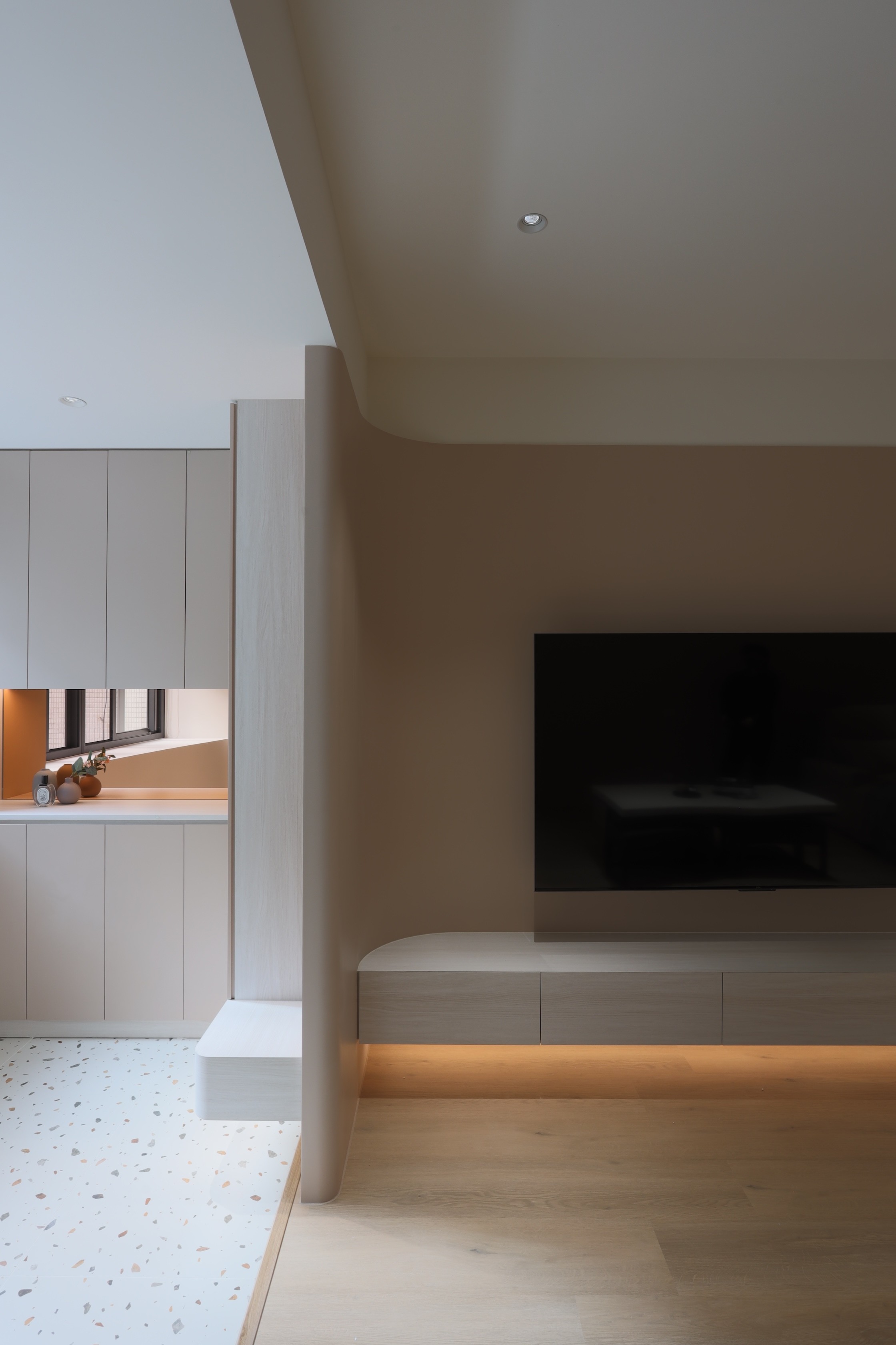 本案以「減法設計」為核心,透過低彩度灰階、溫潤木質與圓角語彙,重新梳理空間中的視覺與使用秩序。公共區域在開放與界定之間取得平衡,使客廳、餐廳與廚房彼此連續卻不相互干擾。大量收納被整合進牆面與轉折量體之中,讓視線保持乾淨,使生活回歸簡單而純粹的狀態。
