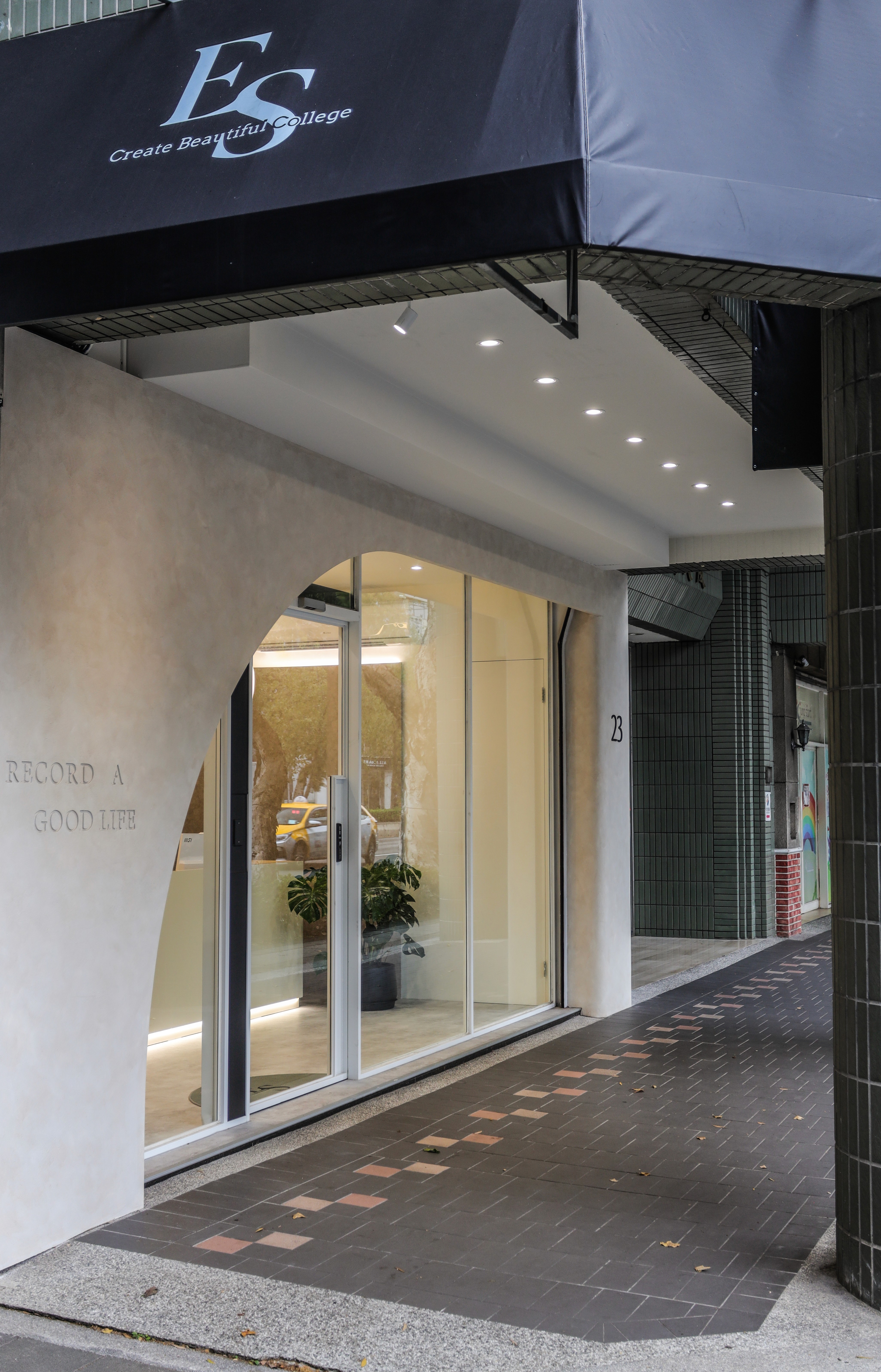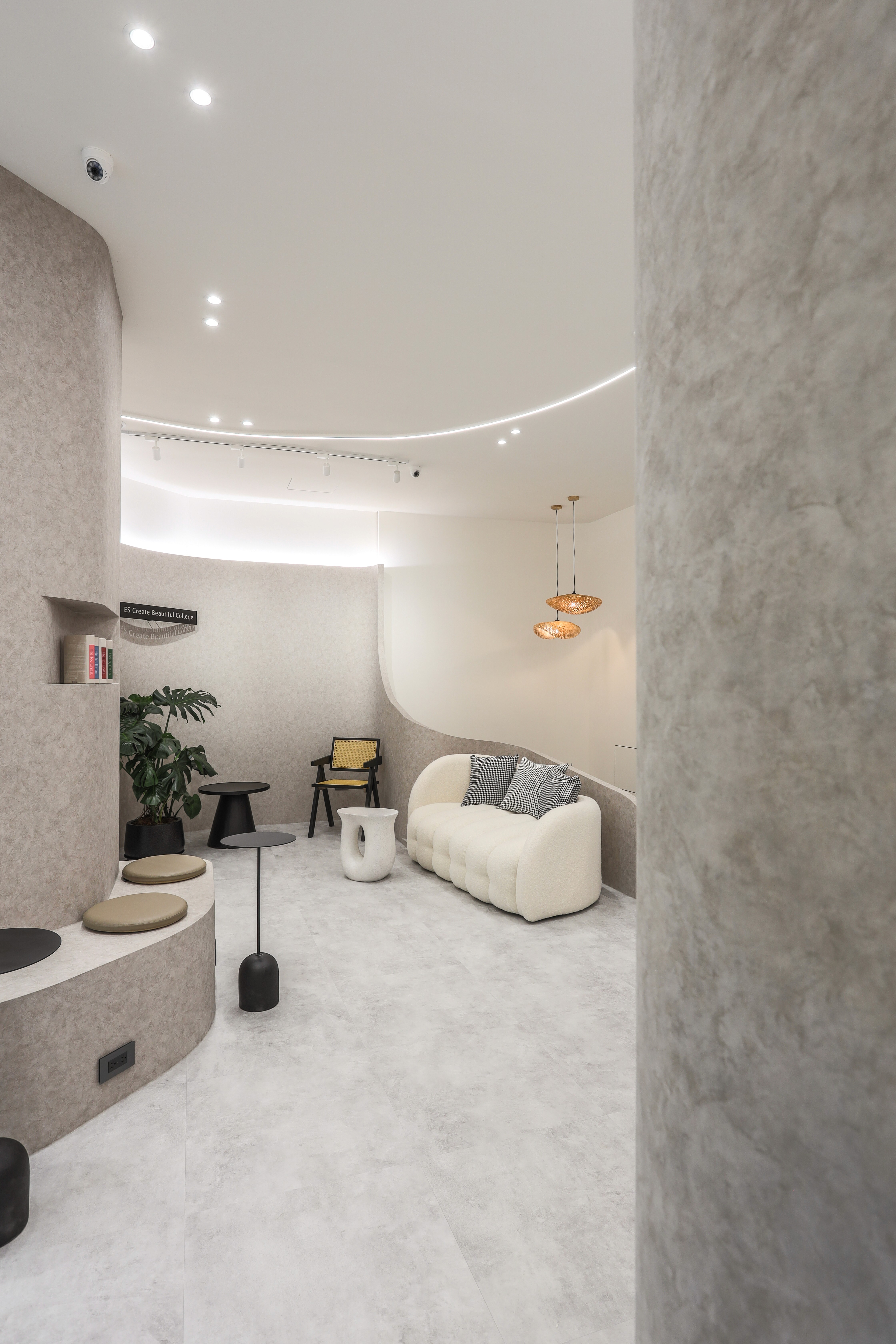 整體空間以圓弧線條與低彩度材質構成,減少銳利轉折,讓視覺與行走動線更為流動。天花的曲線燈帶與間接照明,弱化傳統美容空間的臨床感,使光線成為引導情緒的元素,而非單純照明。